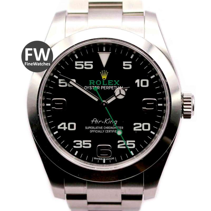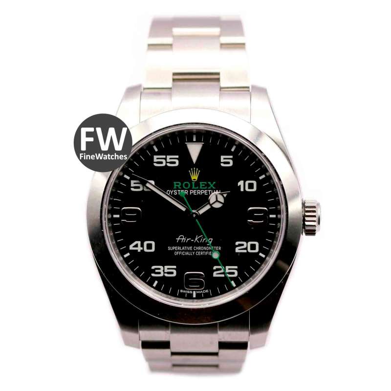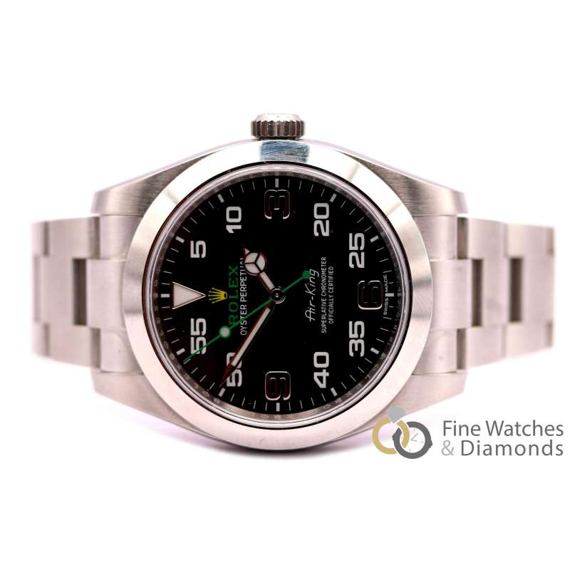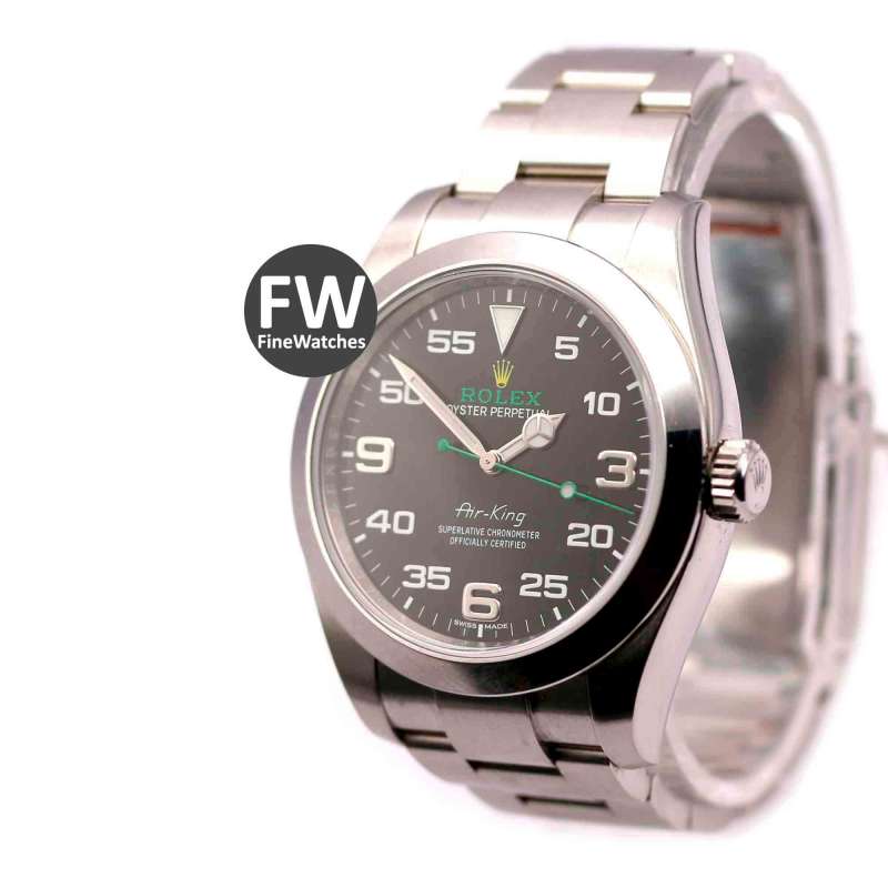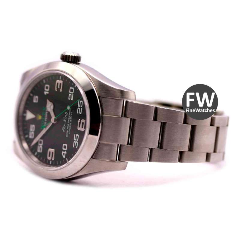 Rolex Air King. Ref-116900. (1) Cómo nuevo. Estuche y documentación (año 2017). Caja de acero, diámetro 40mm. Brazalete de acero. Cristal zafiro, esfera negra, números árabes. Movimiento automático, calibre 3131. Hermetismo 10ATM.