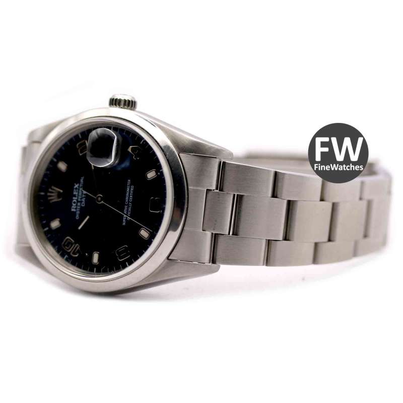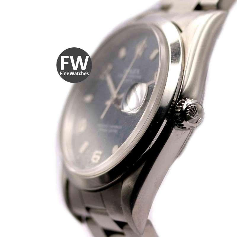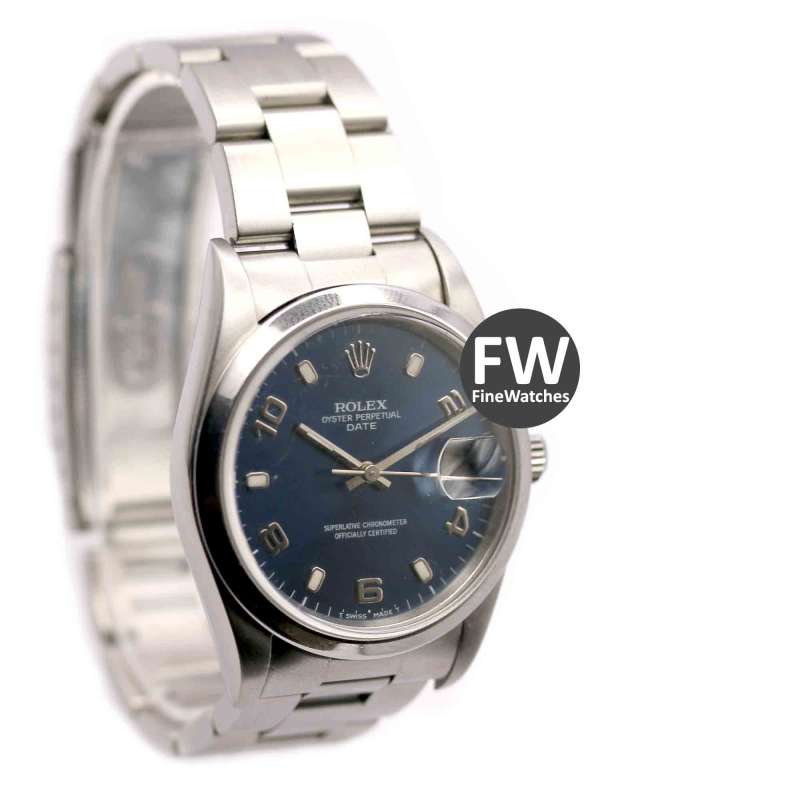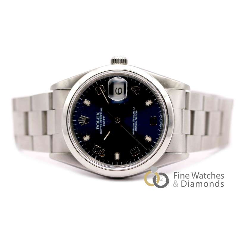 Rolex Oyster Perpetual Date. Ref-15200. (1) Cómo nuevo. Año 1993. Estuche y un año de garantía. Caja de acero, diámetro 34mm. Brazalete de acero. Movimiento automático, calibre 3135. Cristal zafiro, esfera azul, números árabes. Hermetismo 10ATM
