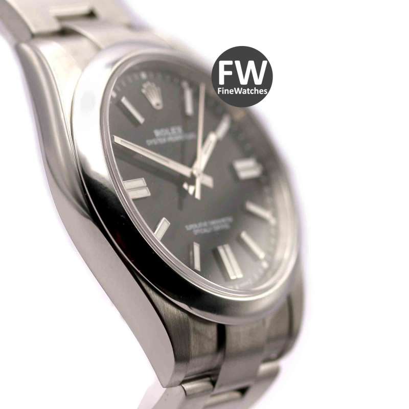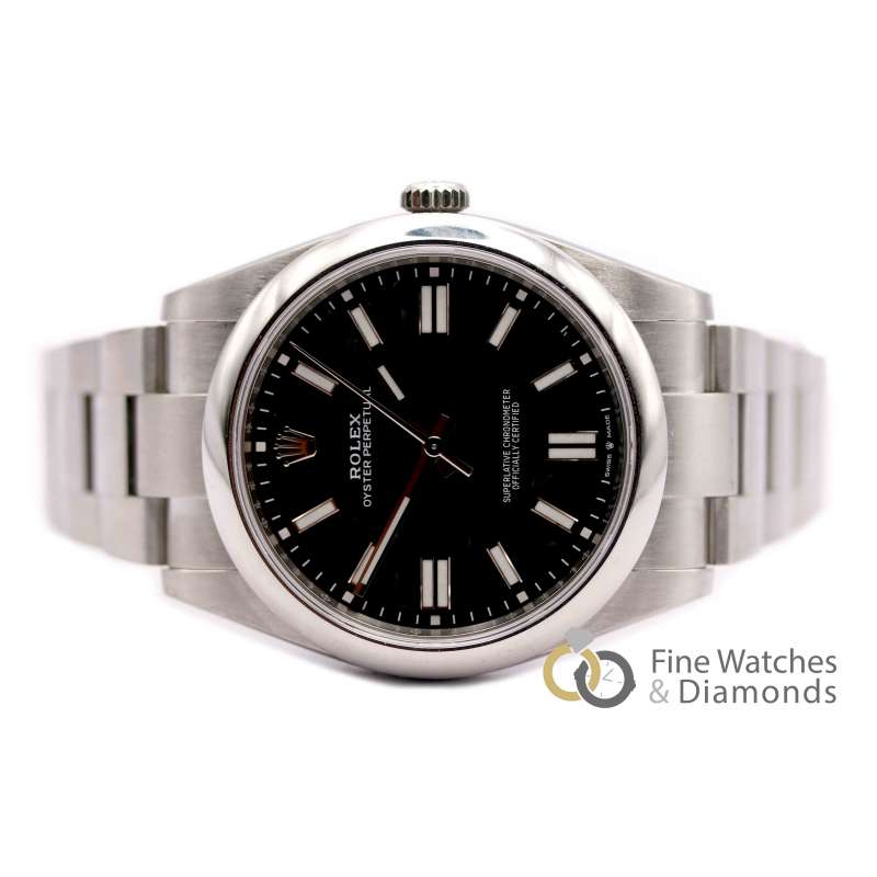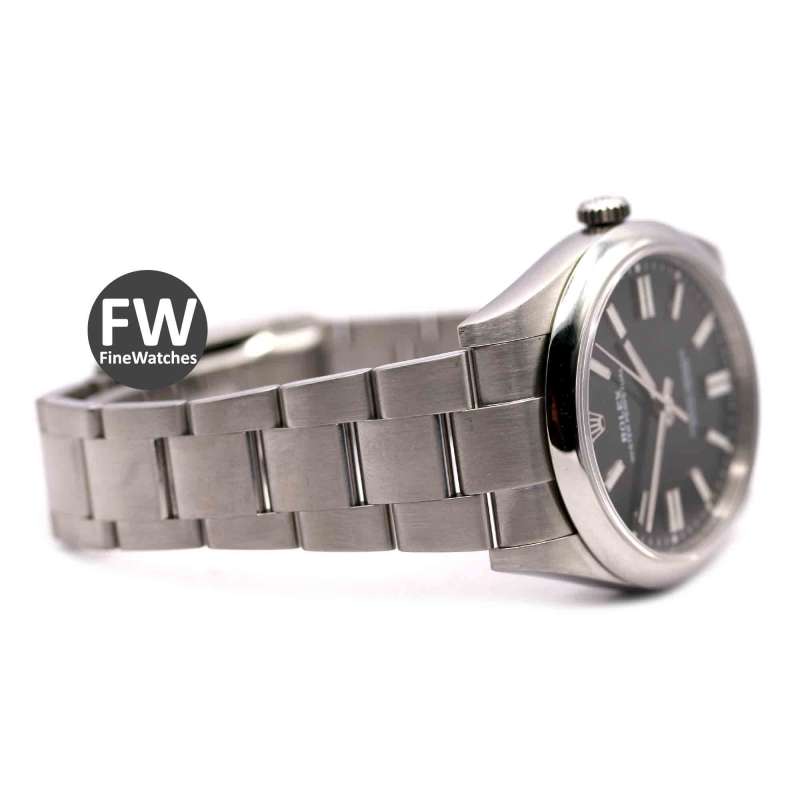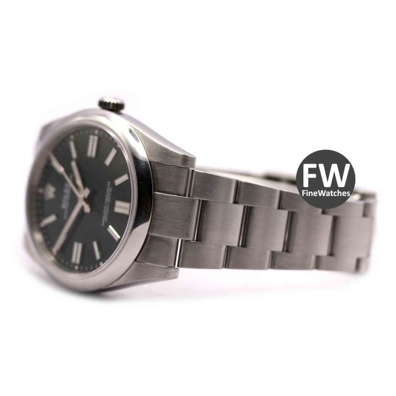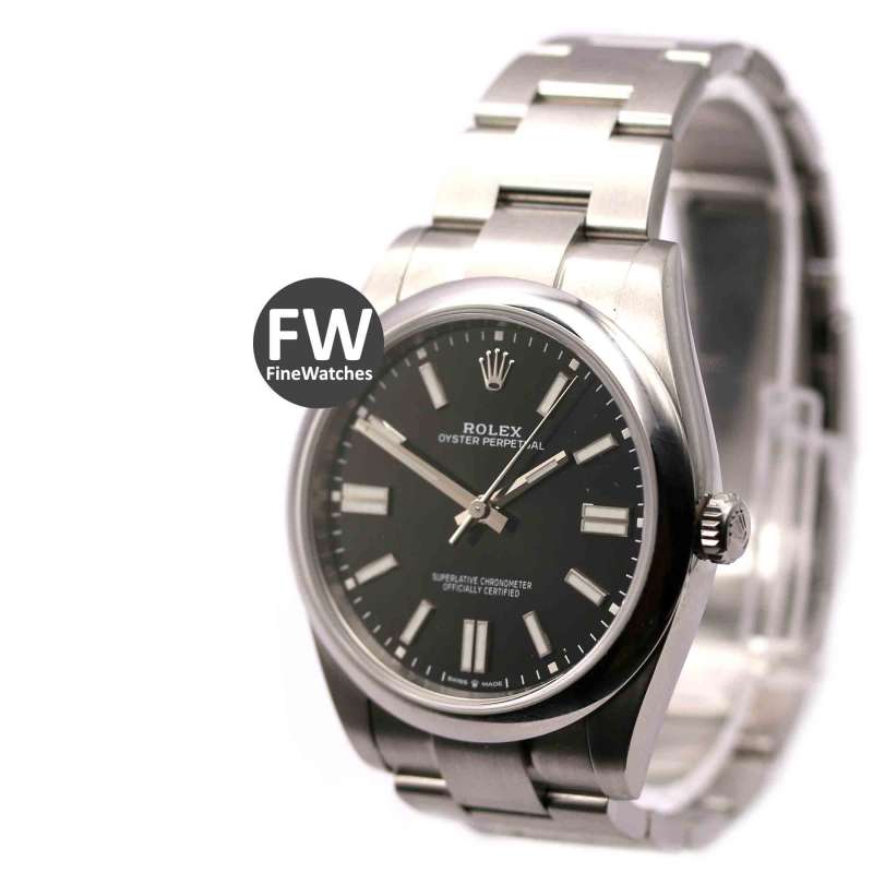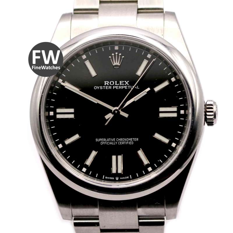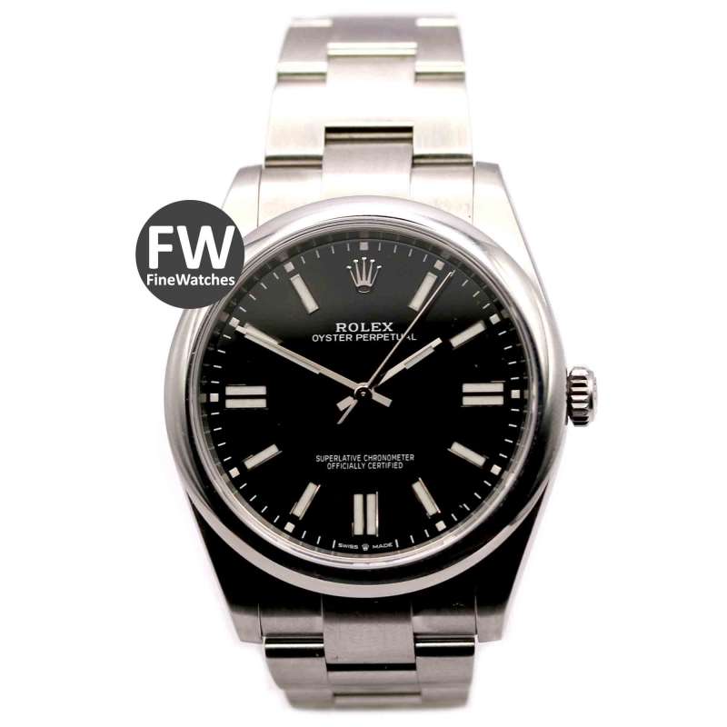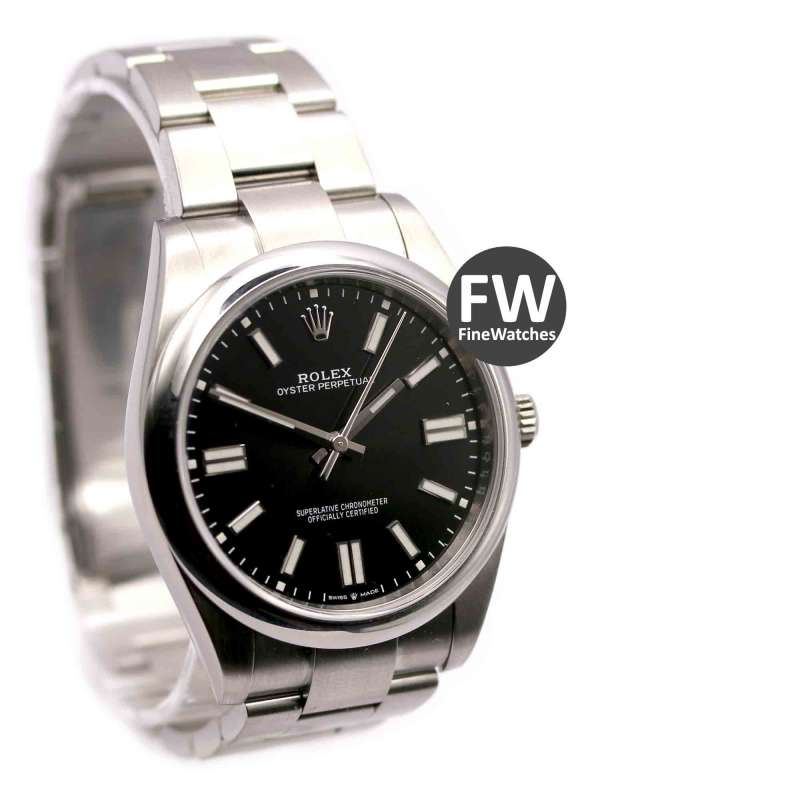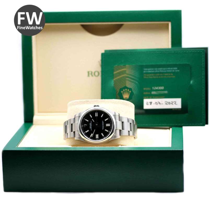 Rolex Oyster Perpetual 41. Réf.124300. (1) Comme neuve. Avec Boîte et papiers (2022). Boîtier en acier, diamètre 41 mm. Bracelet en acier. Mouvement automatique, calibre Rolex 3230. Verre saphir, cadran noir sans chiffres. Étanchéité 10 ATM.